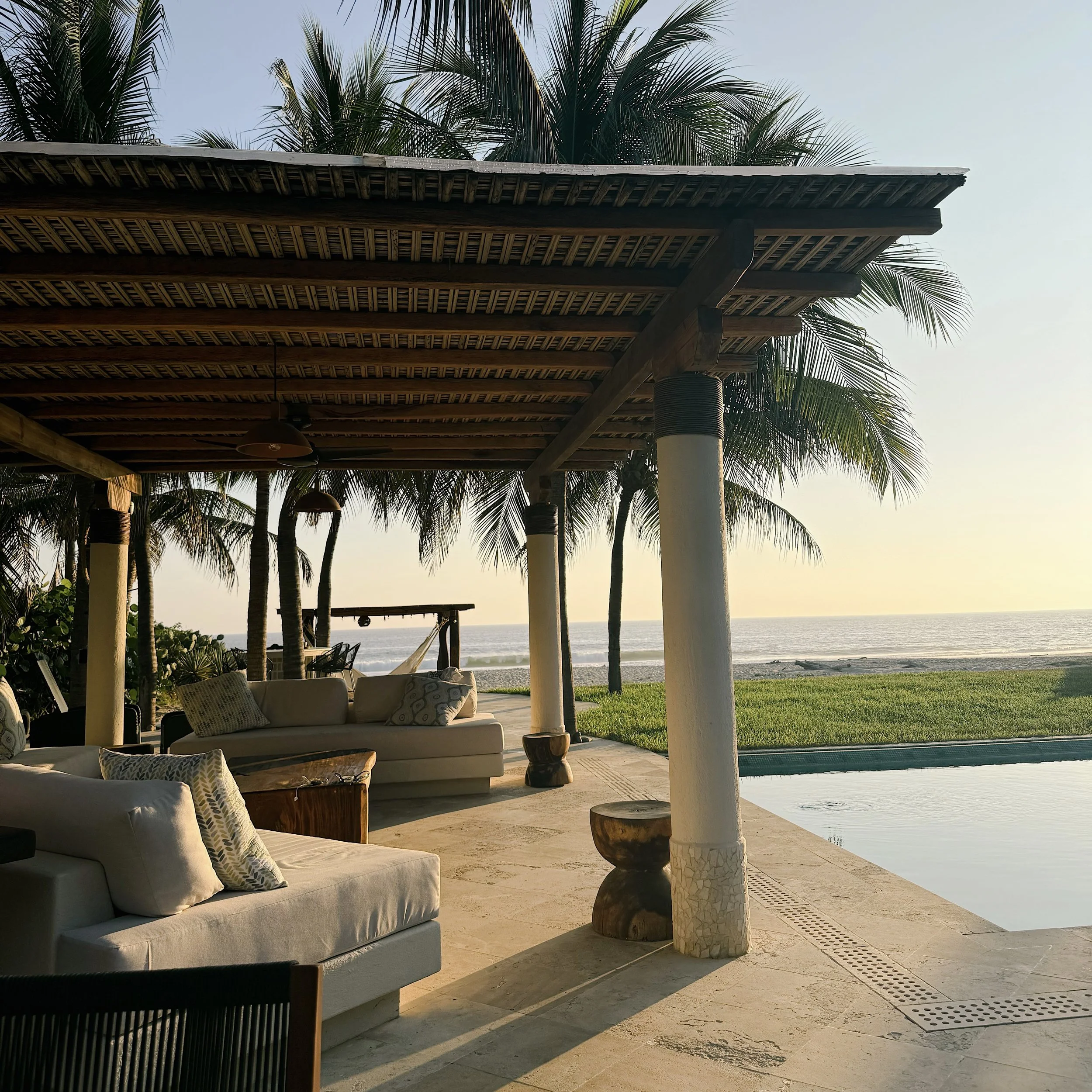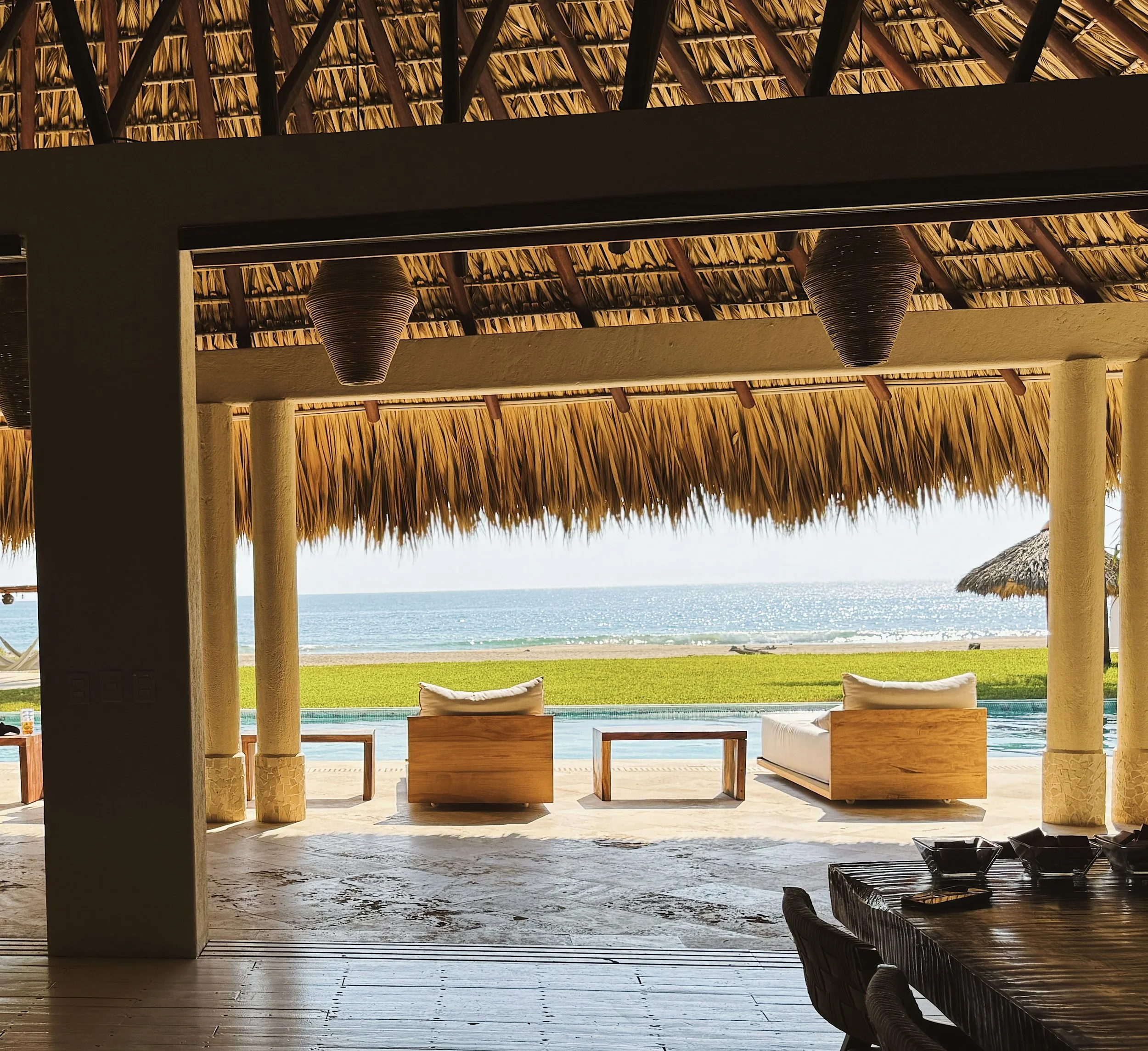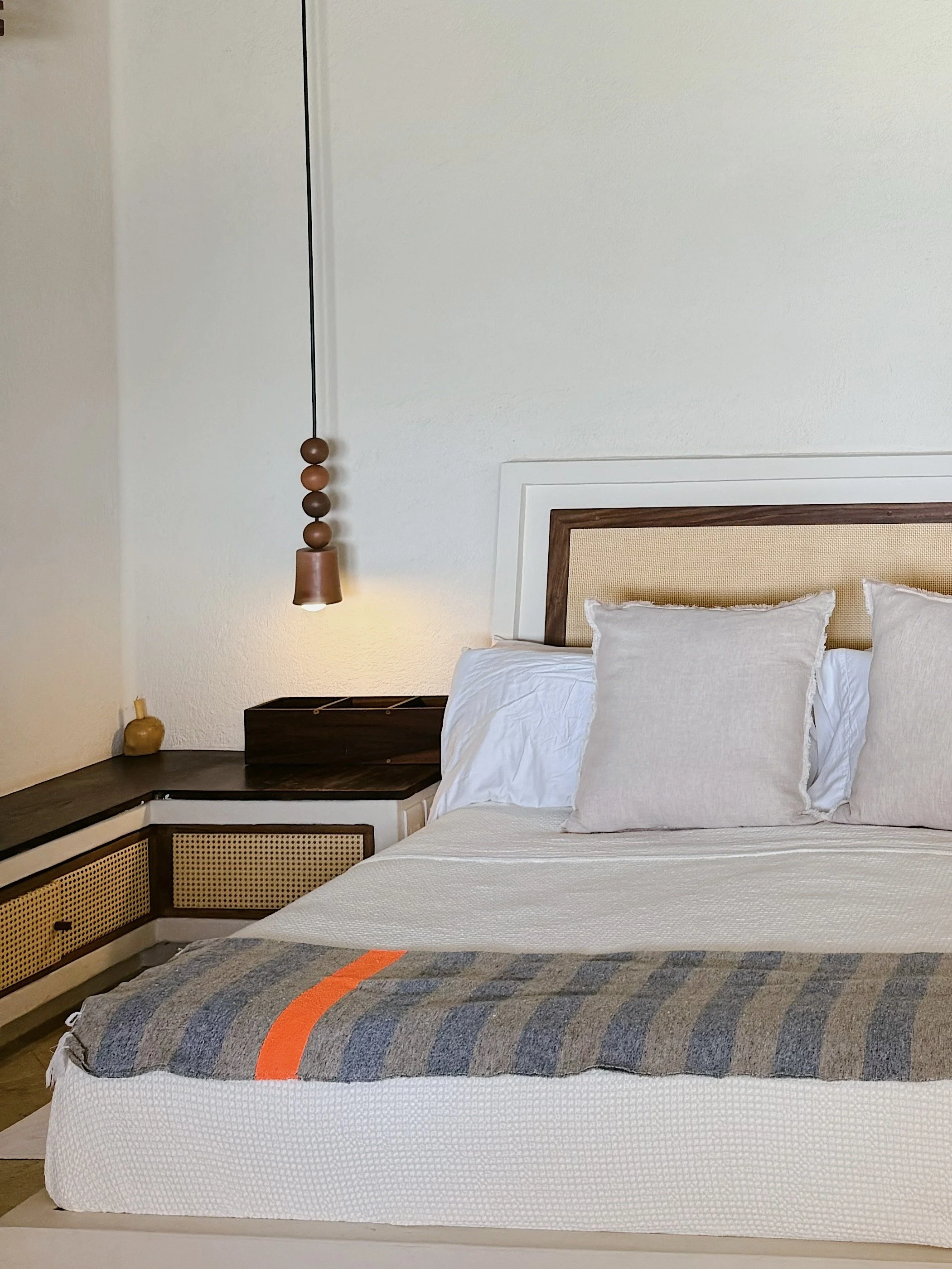 Each beachfront master bedroom has a king size bed and a large private seating area. Details include stone floors, rattan headboards, handmade terracotta light fixtures, custom mirrors, 100% percale cotton bed linens, goose down pillows, and luxury mattresses.
